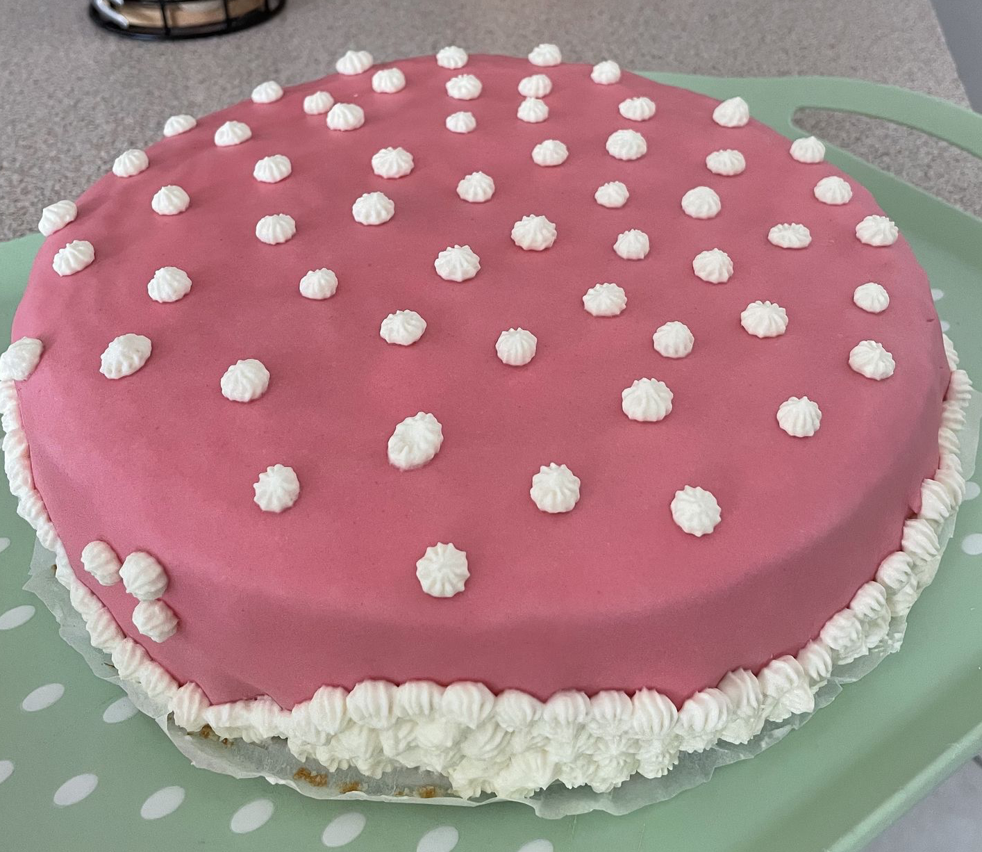 Option 1 : Tu auras besoin d'un gros bloc de pâte à sucre, en fonction de la taille de ton gâteau. Moi je l'avais pris rose, pour rappeler la framboise. J'ai également refais un peu de chantilly afin d'habiller un peu plus mon gâteau.