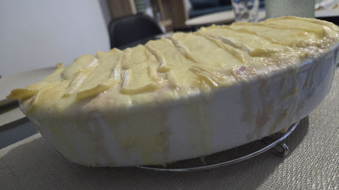 Découpe l’autre moitié du reblochon en tranches et répartis-les joliment sur le dessus.