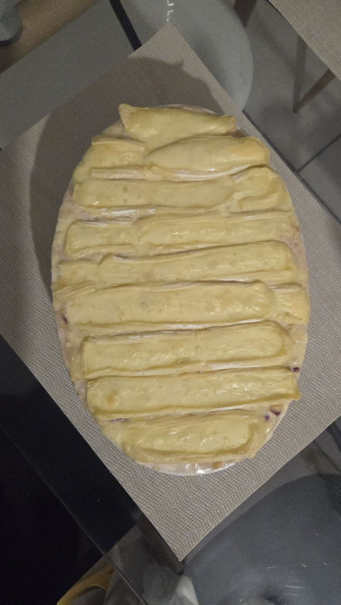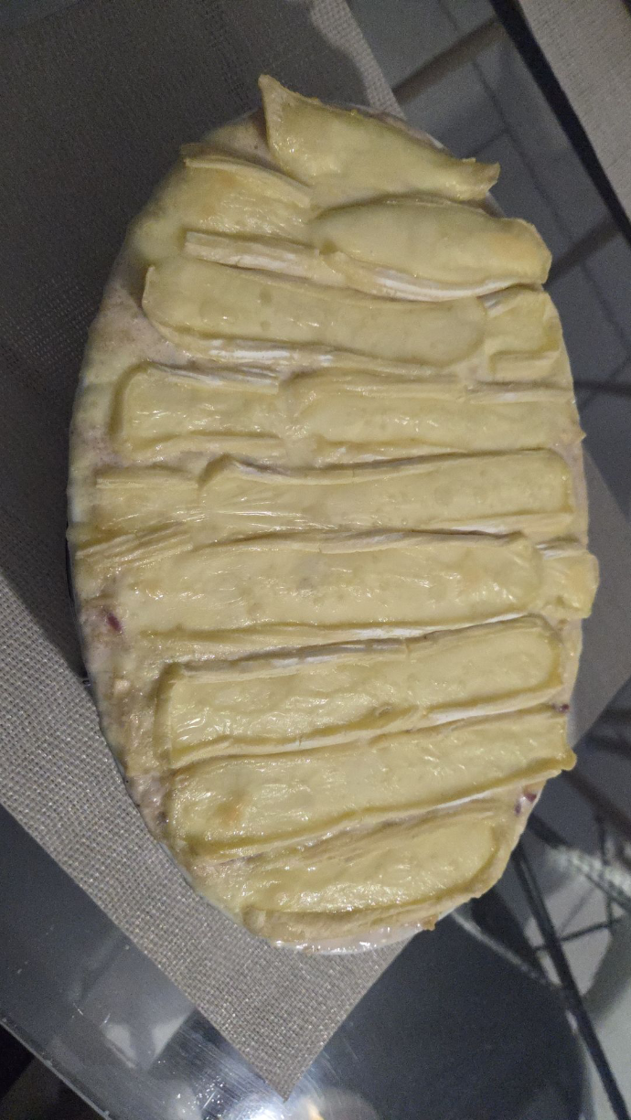 Découpe l’autre moitié du reblochon en tranches et répartis-les joliment sur le dessus.